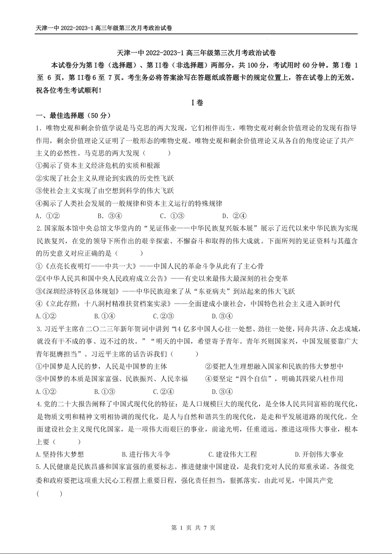 高三政治--天津市第一中学2022-2023学年高三上学期第三次月考