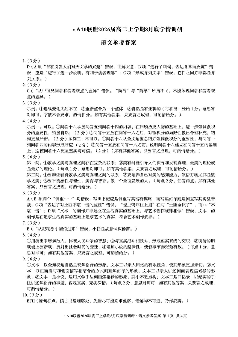高三语文答案--安徽省1号卷·A10联盟2026届高三上学期8月底学情调研