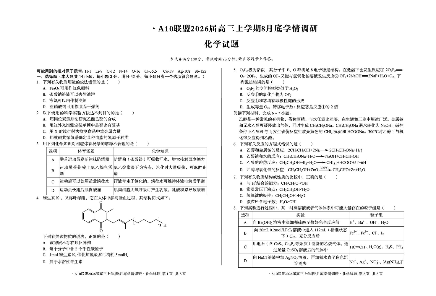 高三化学--安徽省1号卷·A10联盟2026届高三上学期8月底学情调研