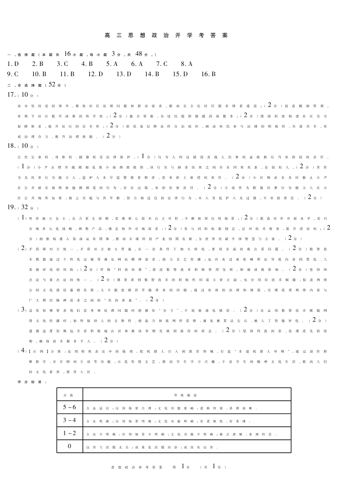 高三政治答案--黑龙江省新时代高中教育联合体2026届高三上学期8月开学测试
