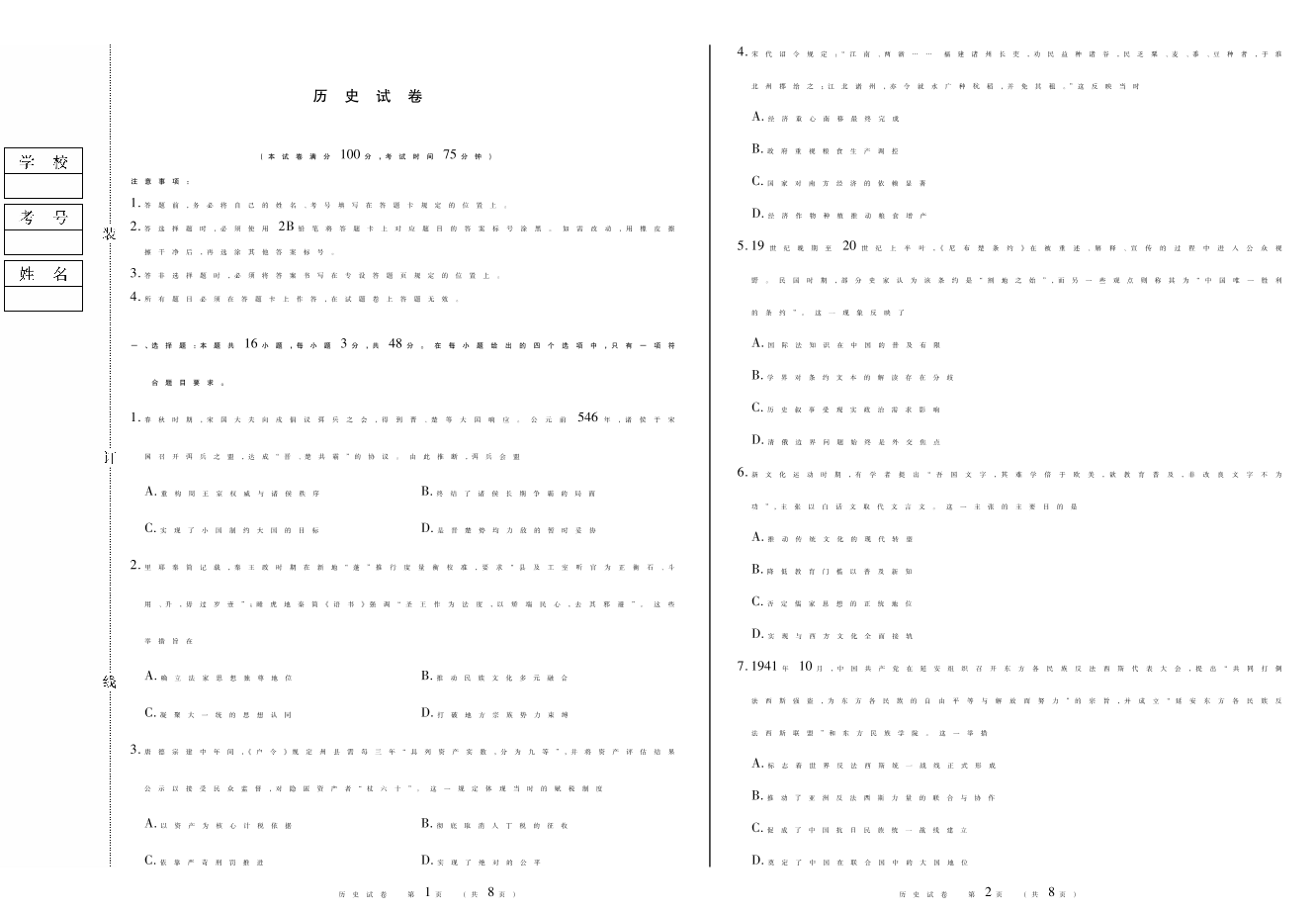 高三历史--黑龙江省新时代高中教育联合体2026届高三上学期8月开学测试