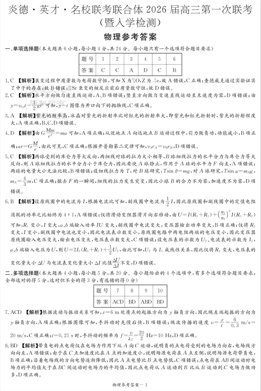 高三物理答案--湖南省炎德·英才·名校联考联合体2026届高三第一次联考