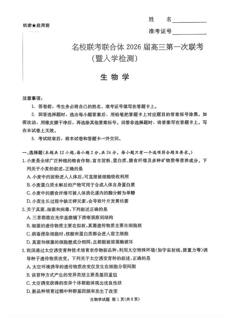 高三生物--湖南省炎德·英才·名校联考联合体2026届高三第一次联考