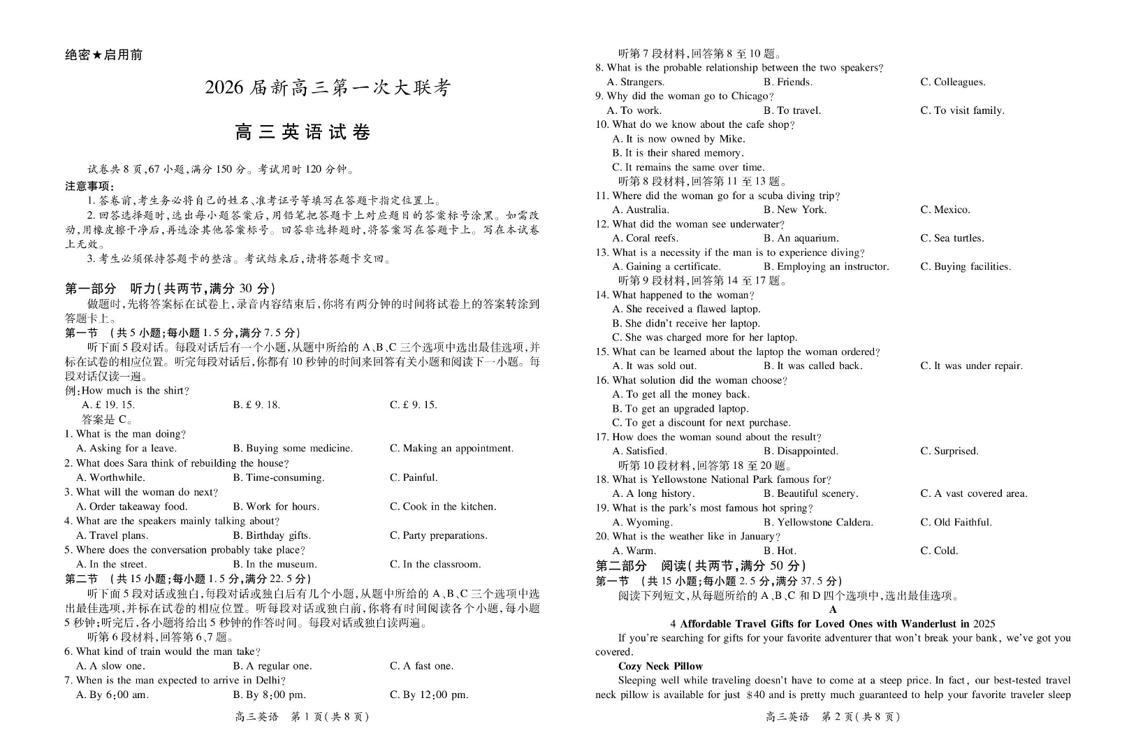 高三英语+答案--江西省上进联考2026届高三上学期第一次联考