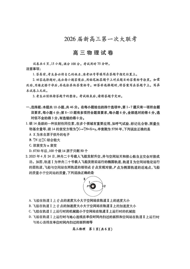 高三物理+答案--江西省上进联考2026届高三上学期第一次联考