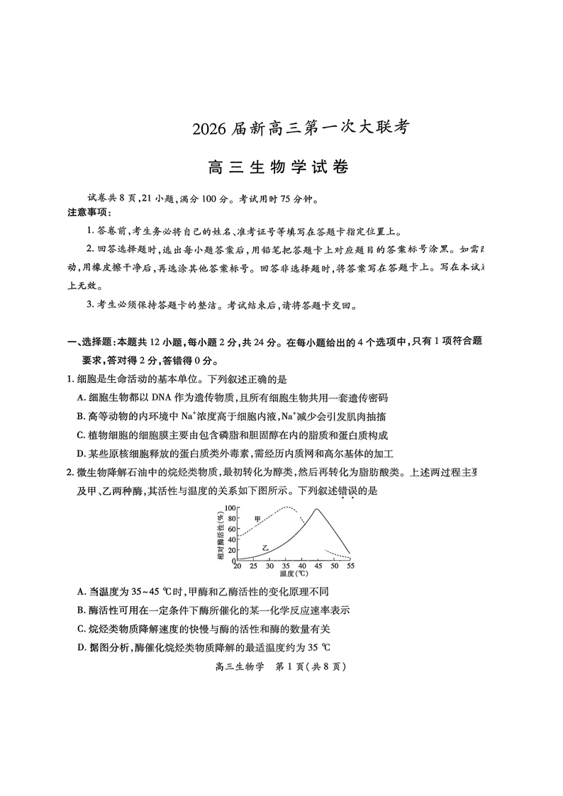 高三生物+答案--江西省上进联考2026届高三上学期第一次联考