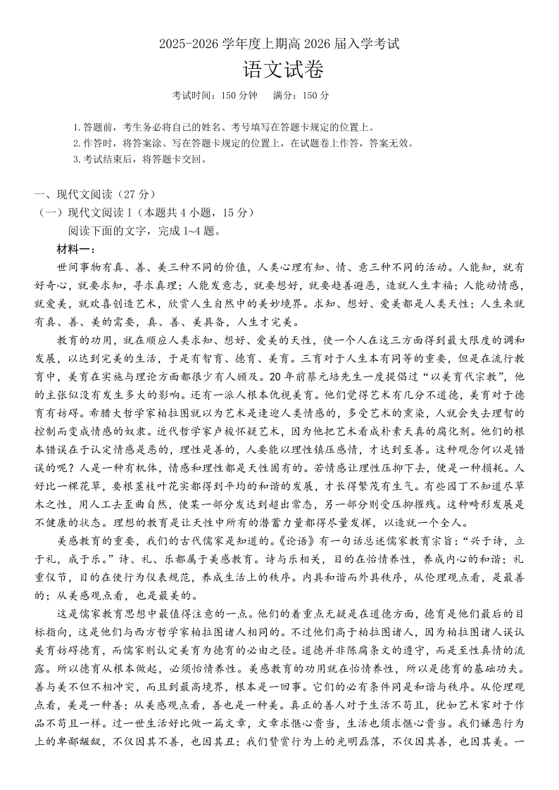 高三语文--四川省成都市第七中学2026届高三上学期8月入学考试
