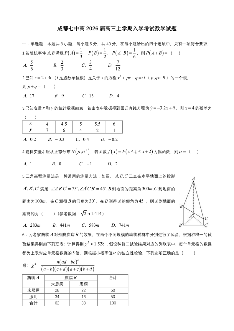 高三数学--四川省成都市第七中学2026届高三上学期8月入学考试