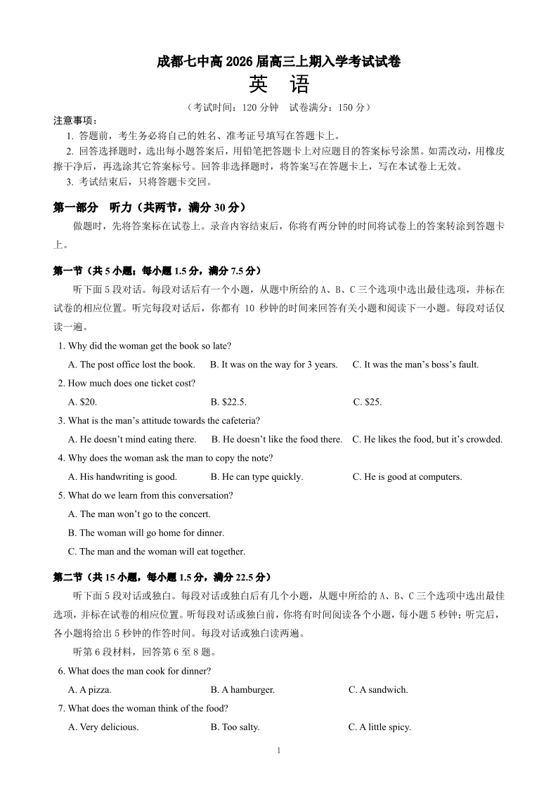 高三英语--四川省成都市第七中学2026届高三上学期8月入学考试