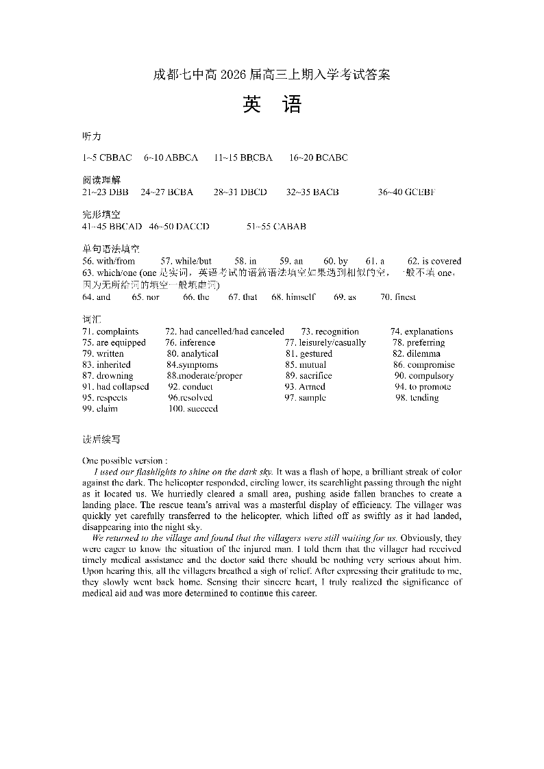 高三英语答案--四川省成都市第七中学2026届高三上学期8月入学考试