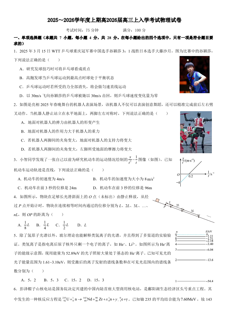 高三物理--四川省成都市第七中学2026届高三上学期8月入学考试