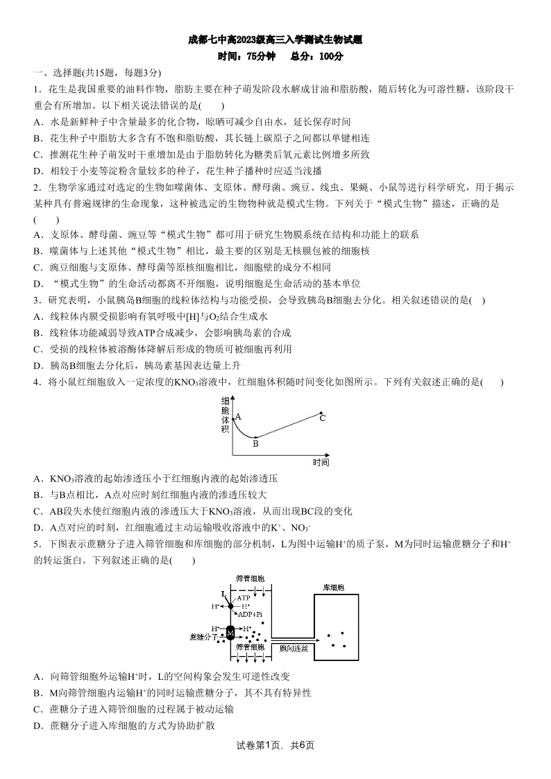 高三生物--四川省成都市第七中学2026届高三上学期8月入学考试