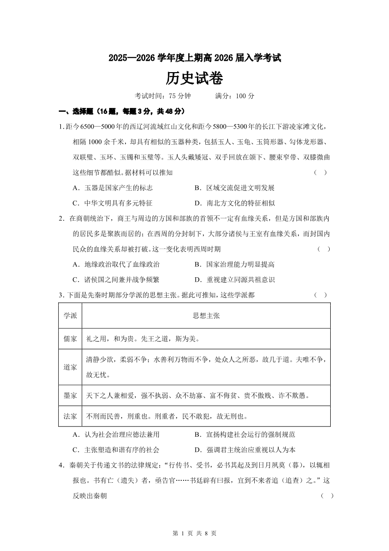 高三历史--四川省成都市第七中学2026届高三上学期8月入学考试