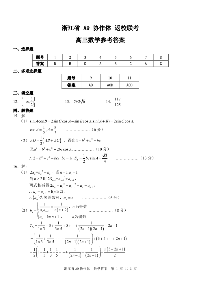 高三数学答案--浙江省A9协作体2026届高三8月暑假返校联考