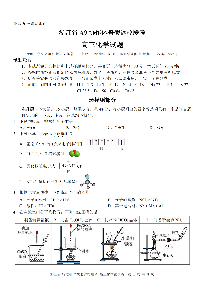 高三化学--浙江省A9协作体2026届高三8月暑假返校联考