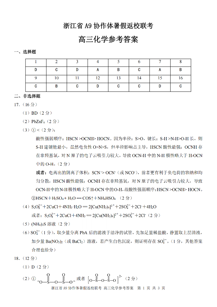 高三化学答案--浙江省A9协作体2026届高三8月暑假返校联考