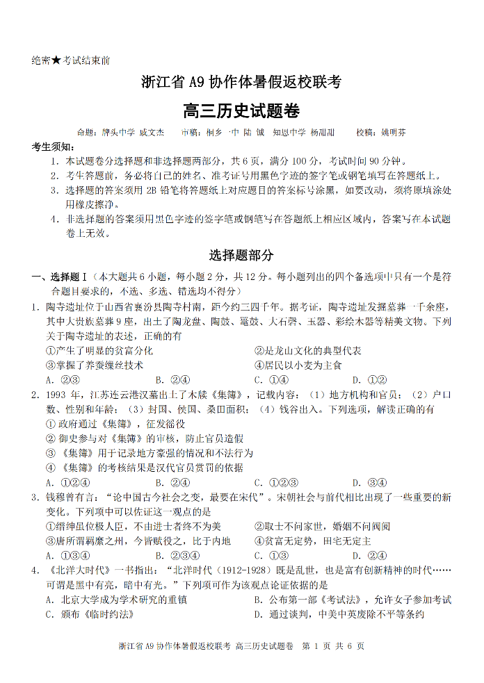 高三历史--浙江省A9协作体2026届高三8月暑假返校联考