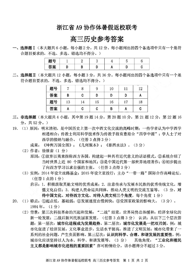 高三历史答案--浙江省A9协作体2026届高三8月暑假返校联考