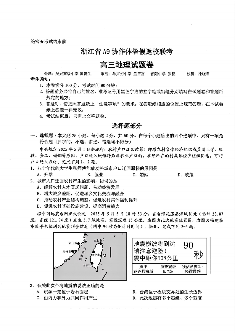 高三地理--浙江省A9协作体2026届高三8月暑假返校联考