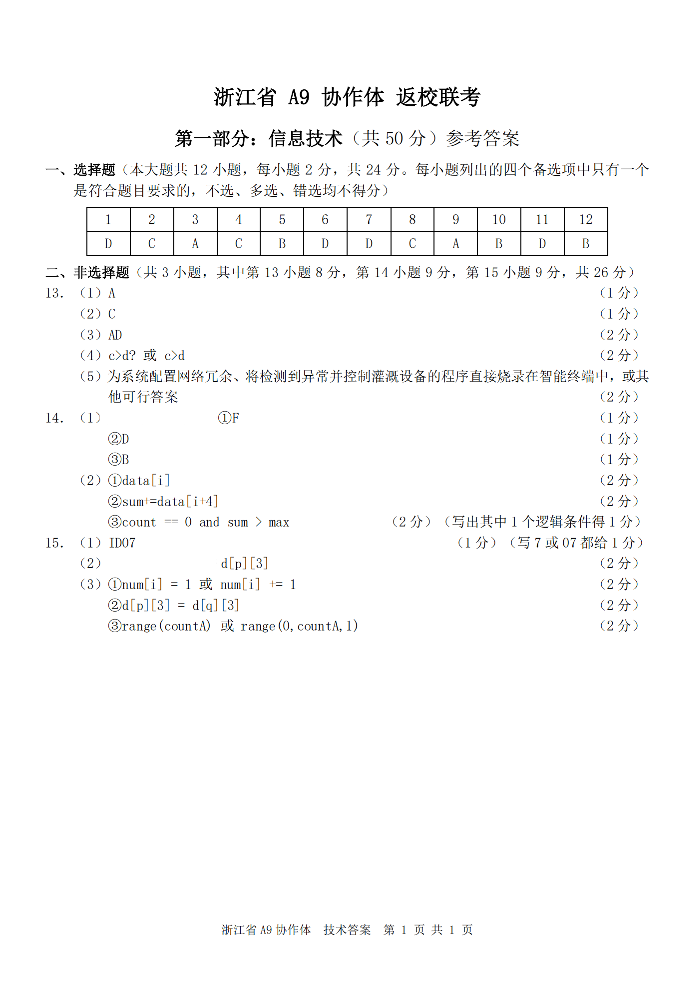 高三技术答案--浙江省A9协作体2026届高三8月暑假返校联考