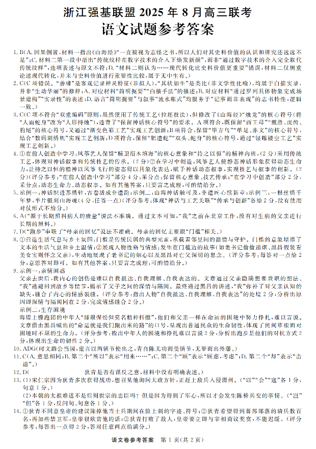 高三语文答案--浙江省强基联盟2026届高三8月开学联考