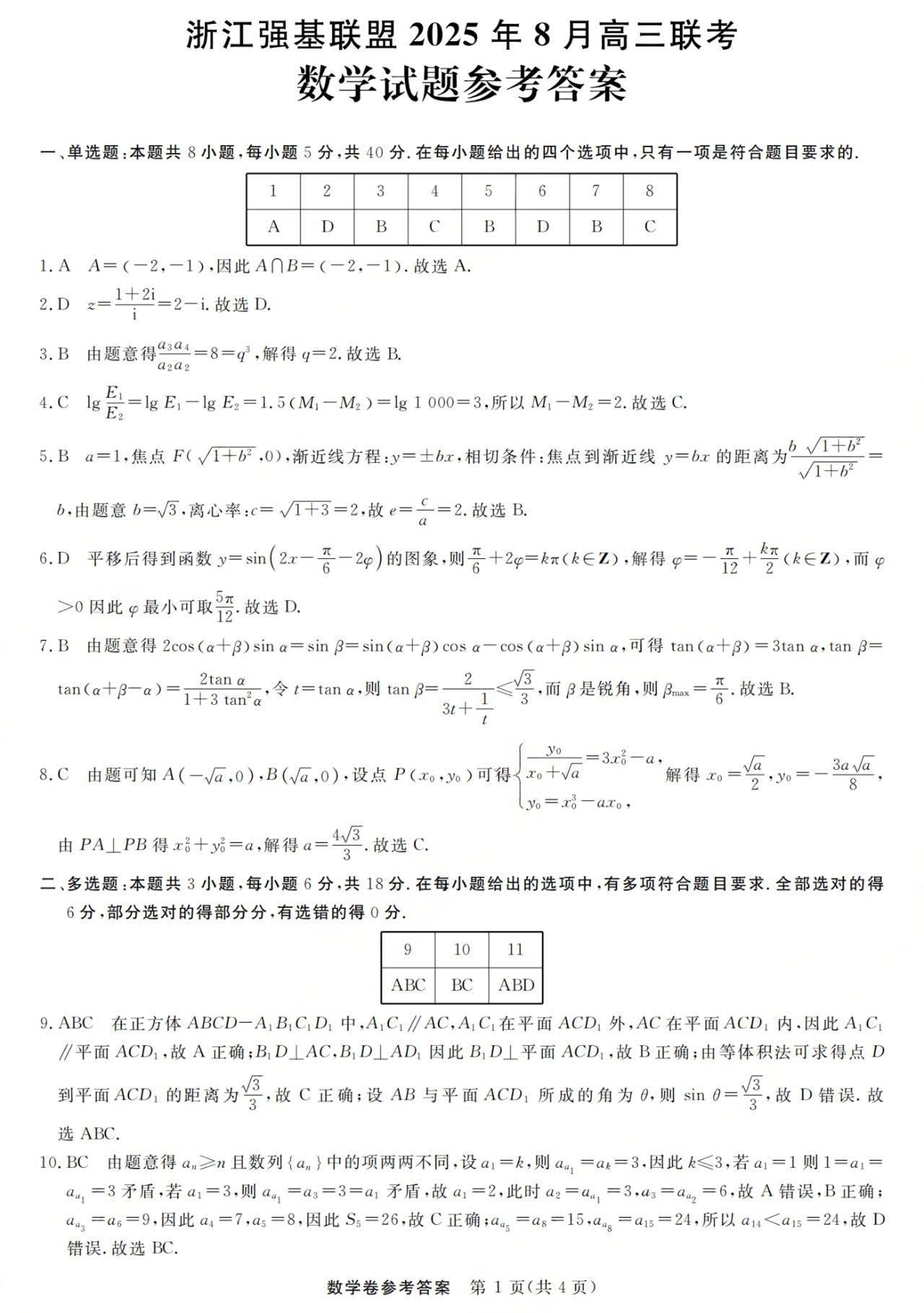 高三数学答案--浙江省强基联盟2026届高三8月开学联考