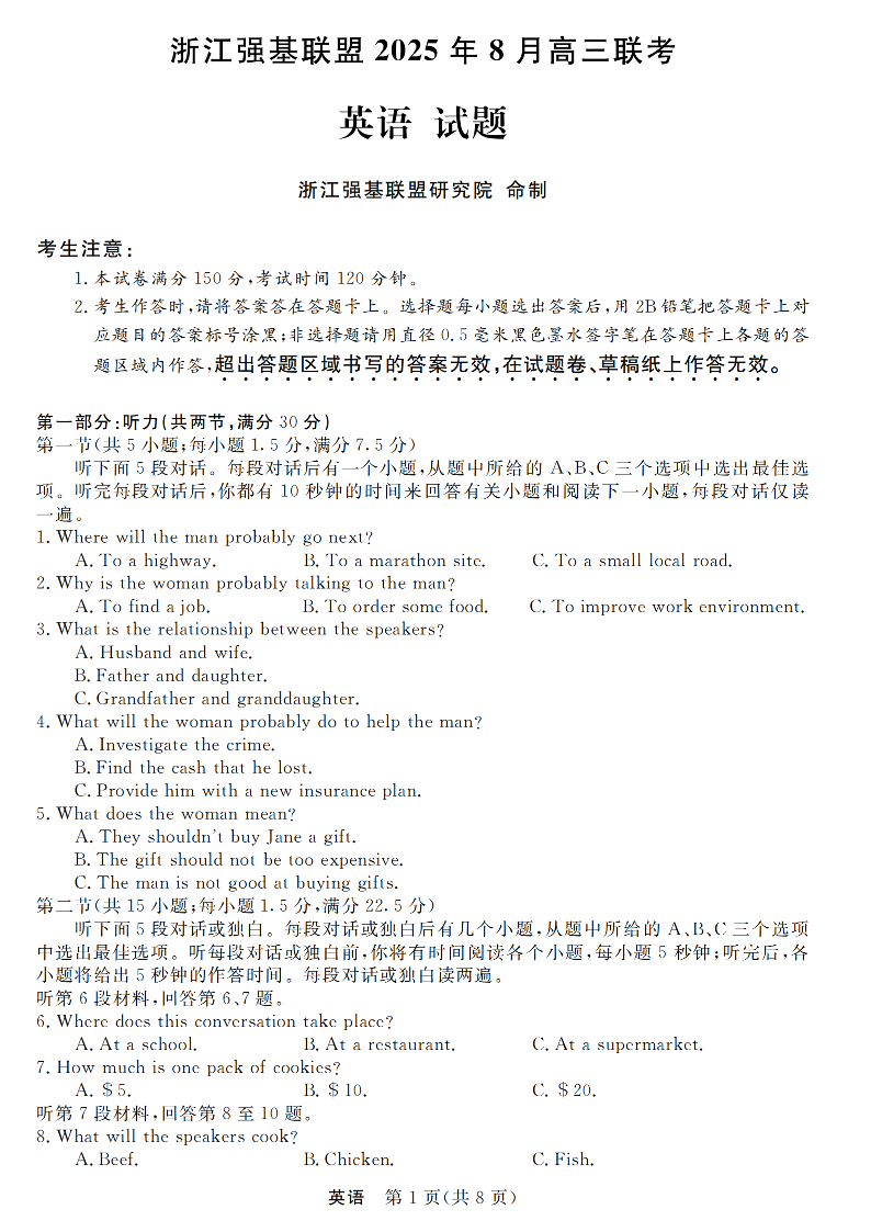 高三英语--浙江省强基联盟2026届高三8月开学联考