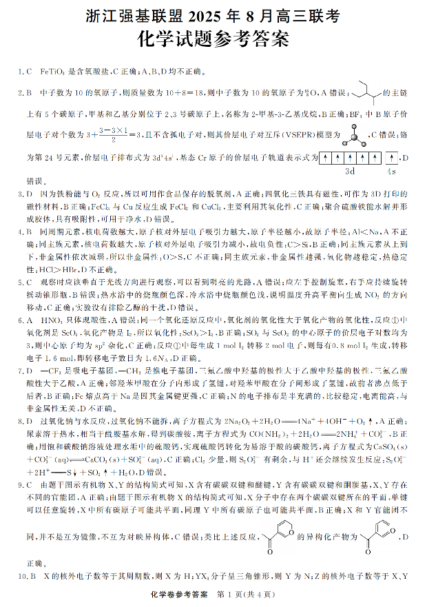 高三化学答案--浙江省强基联盟2026届高三8月开学联考