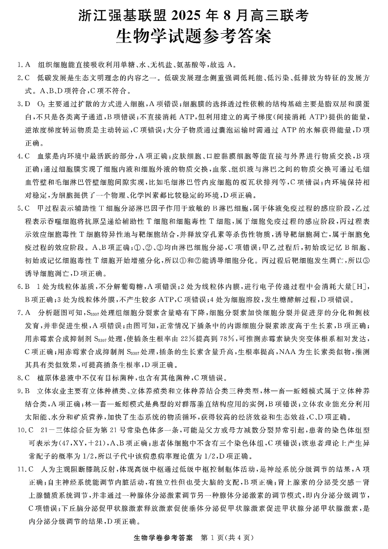 高三生物答案--浙江省强基联盟2026届高三8月开学联考