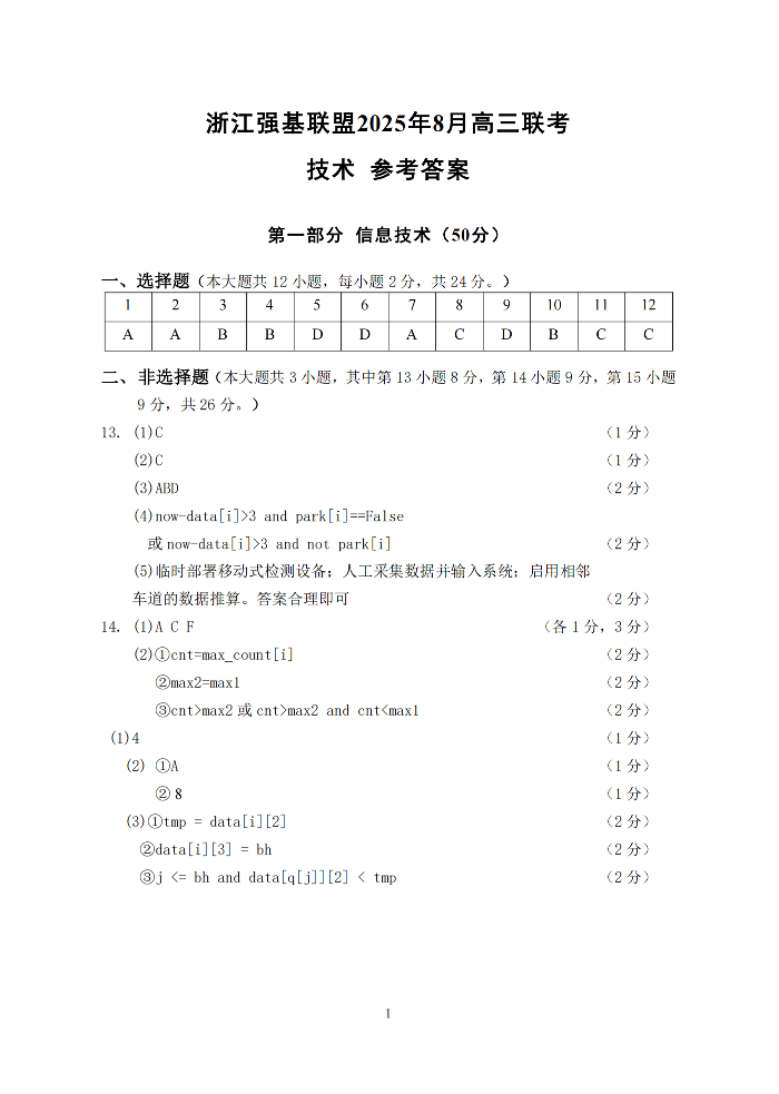 高三技术答案--浙江省强基联盟2026届高三8月开学联考