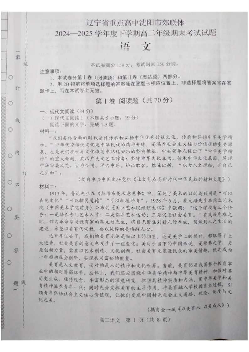 高三语文+答案--辽宁省重点高中沈阳市郊联体2024-2025学年高二下学期期末考试