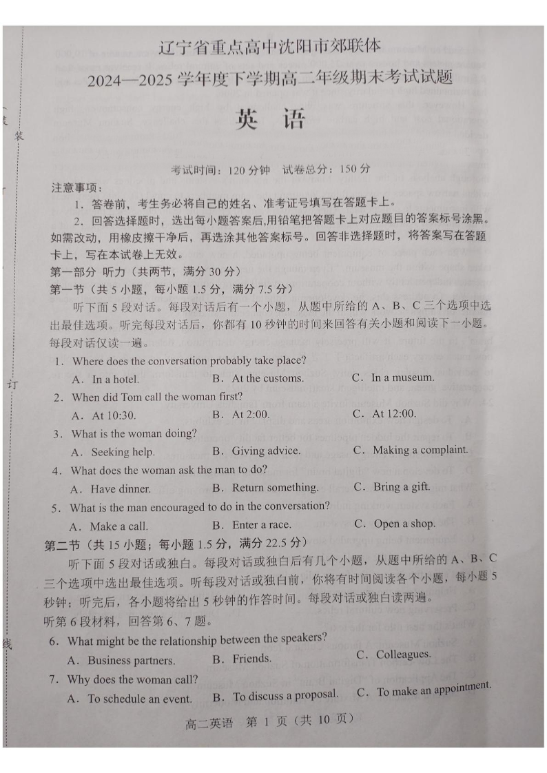 高三英语+答案--辽宁省重点高中沈阳市郊联体2024-2025学年高二下学期期末考试