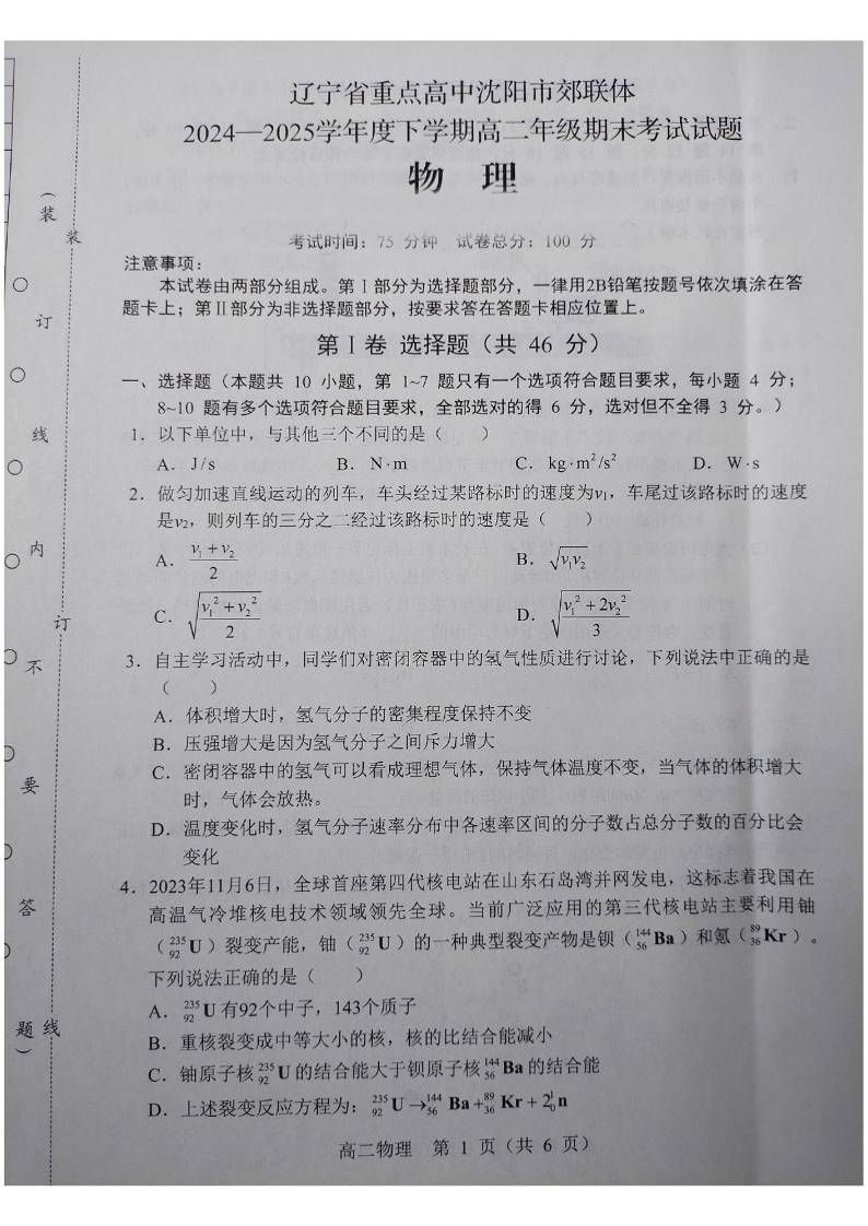 高三物理+答案--辽宁省重点高中沈阳市郊联体2024-2025学年高二下学期期末考试