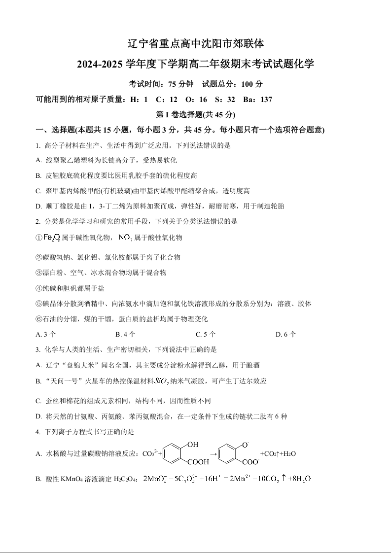 高三化学+答案--辽宁省重点高中沈阳市郊联体2024-2025学年高二下学期期末考试