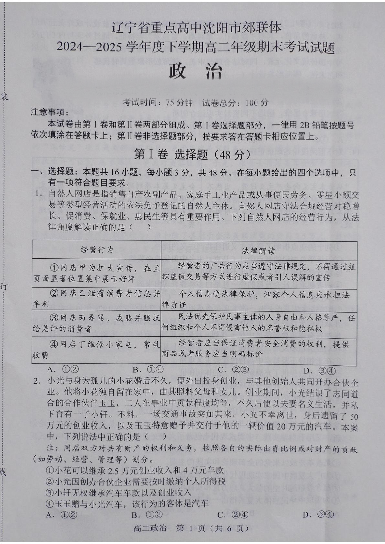 高三政治+答案--辽宁省重点高中沈阳市郊联体2024-2025学年高二下学期期末考试