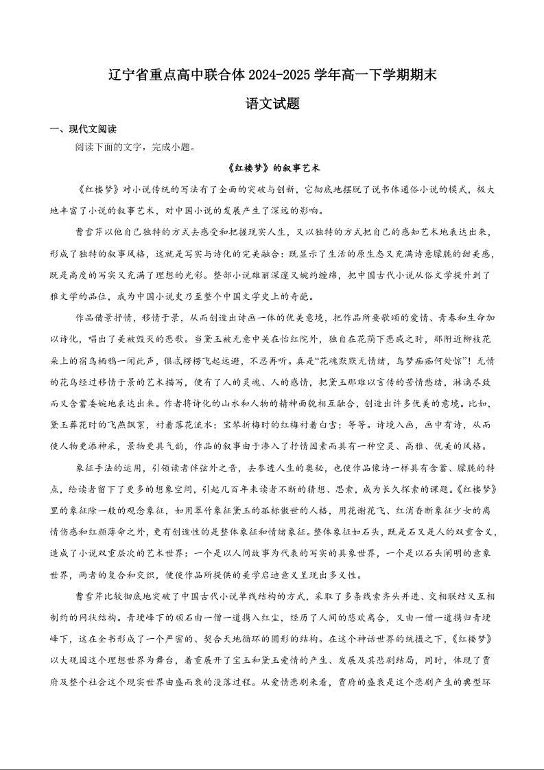 高三语文+答案--辽宁省重点高中联合体2024-2025学年高一下学期7月期末考试