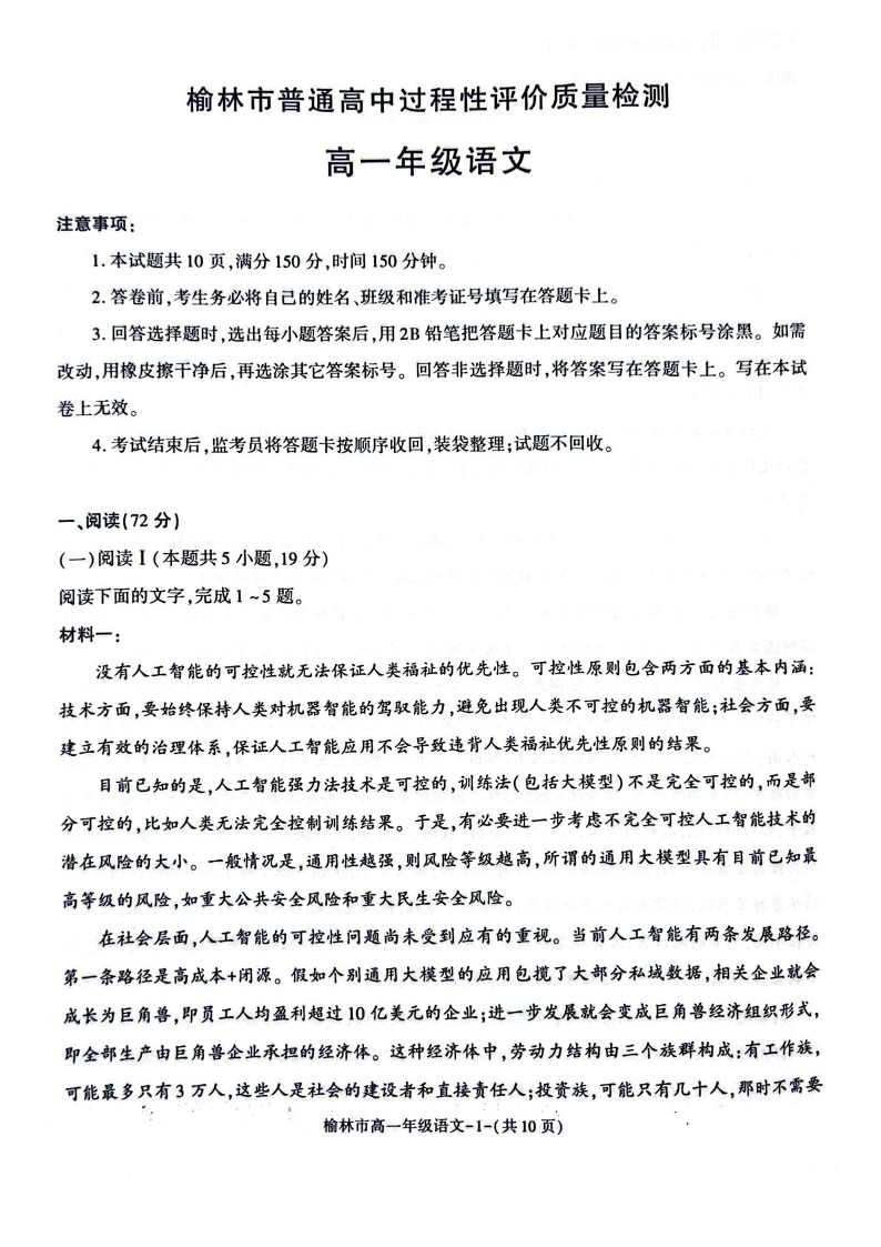 高三语文+答案--陕西省榆林市2024-2025学年高一下学期期末考试
