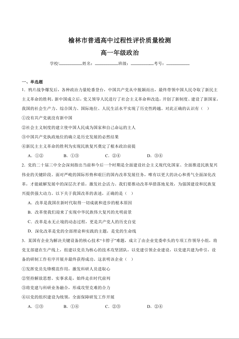 高三政治+答案--陕西省榆林市2024-2025学年高一下学期期末考试