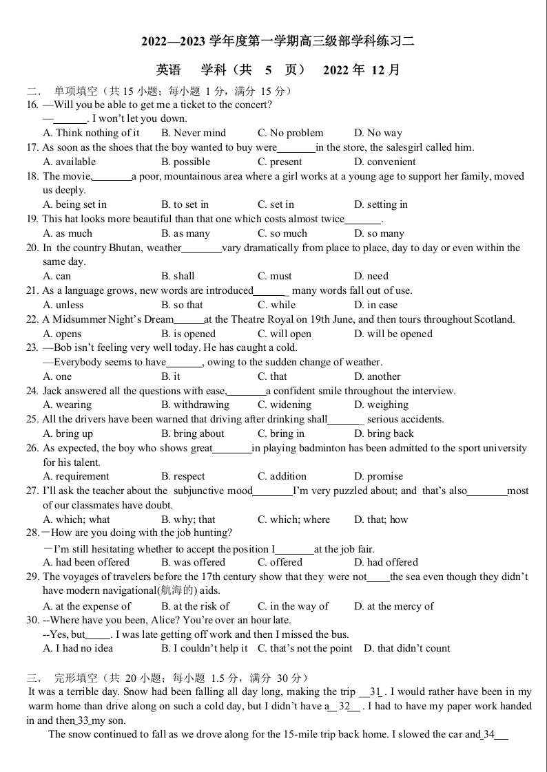 高三英语--天津市新华中学2022-2023学年高三上学期第二次月考