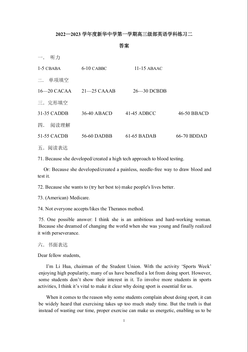 高三英语答案--天津市新华中学2022-2023学年高三上学期第二次月考