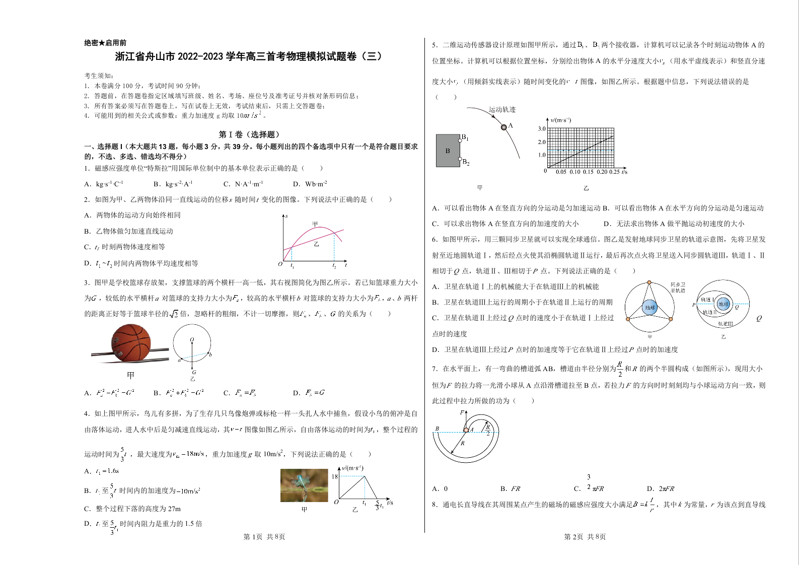 高三物理+答案--浙江省舟山市2022-2023学年高三首考模拟(三)