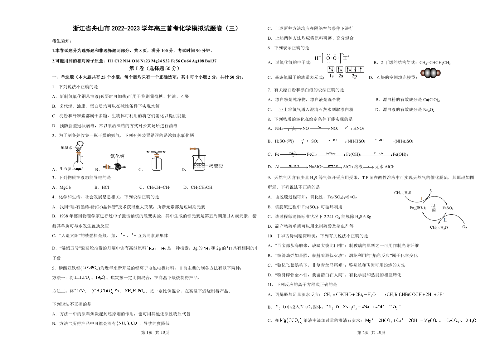 高三化学+答案--浙江省舟山市2022-2023学年高三首考模拟(三)