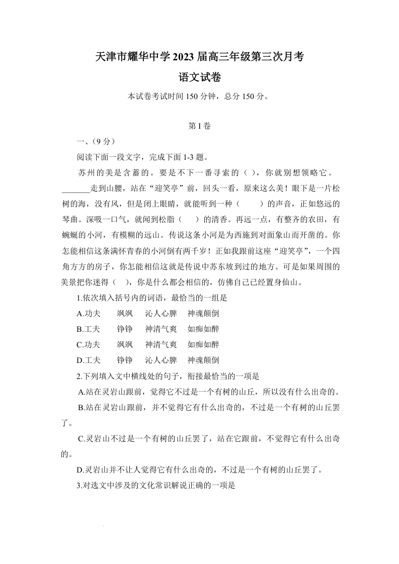 高三语文--天津市耀华中学高三上学期第三次月考