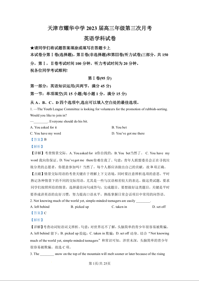 高三英语答案--天津市耀华中学高三上学期第三次月考