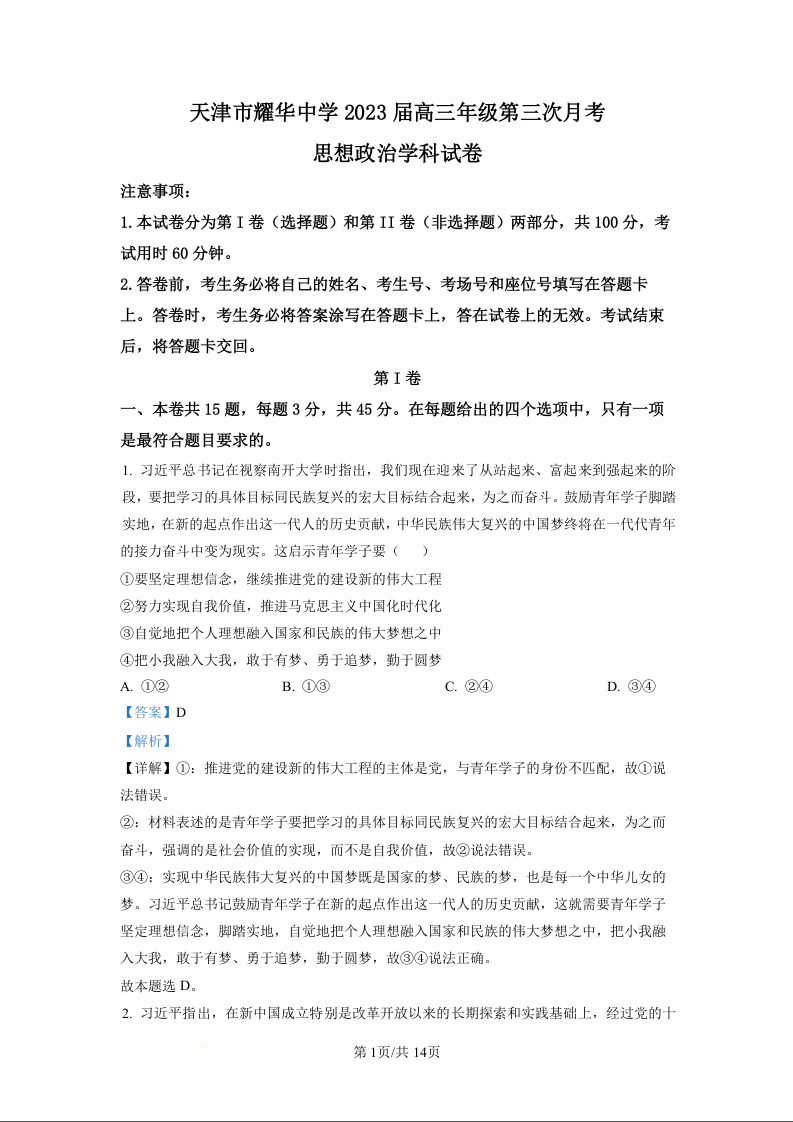 高三政治答案--天津市耀华中学高三上学期第三次月考