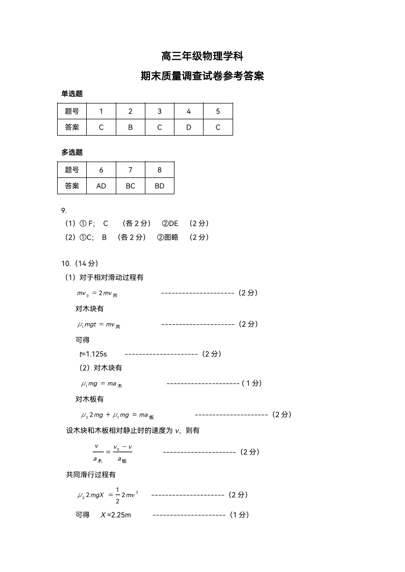 高三物理答案--天津市和平区2022-2023学年高三上学期期末考试