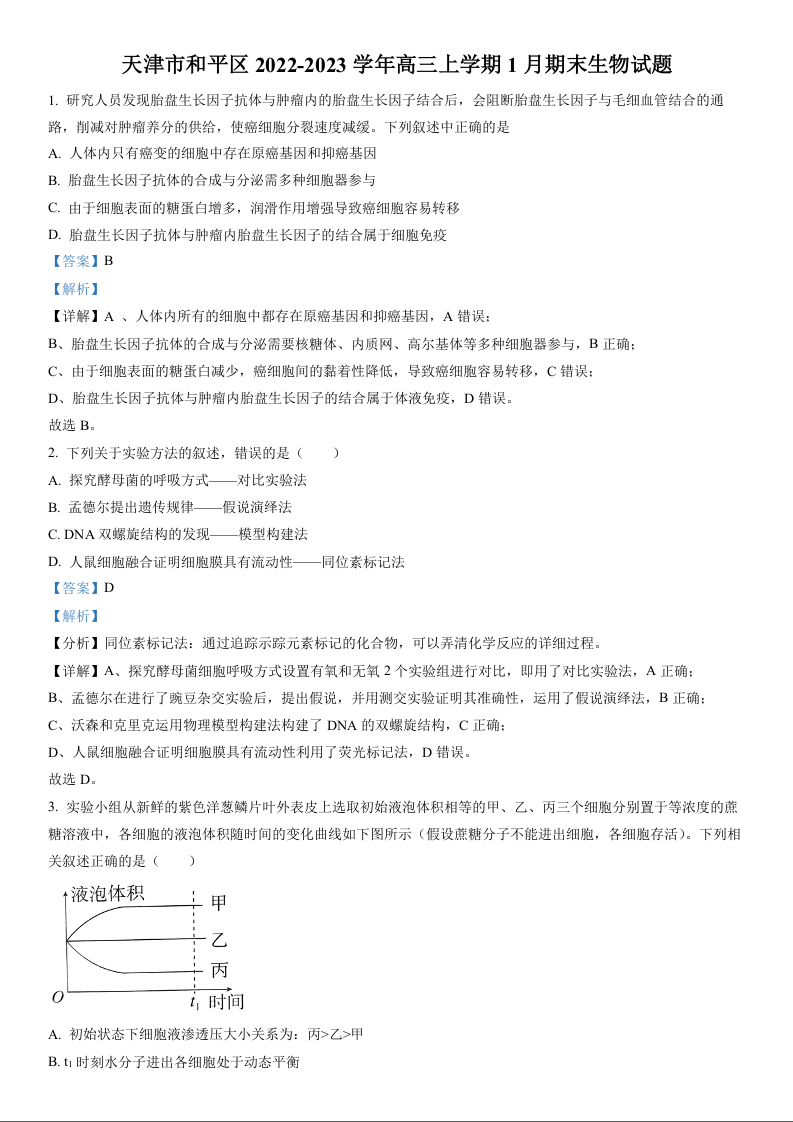 高三生物(解析版)--天津市和平区2022-2023学年高三上学期期末考试