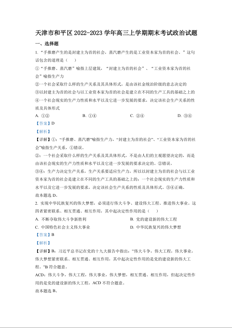 高三政治(解析版)--天津市和平区2022-2023学年高三上学期期末考试
