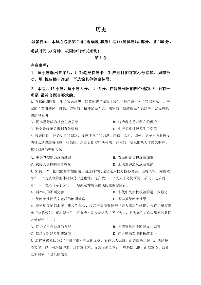 高三历史(原卷版)--天津市和平区2022-2023学年高三上学期期末考试