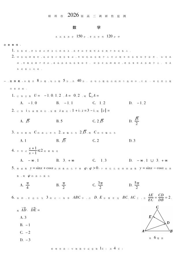 高三数学--安徽省蚌埠市2026届高三上学期8月调研性监测